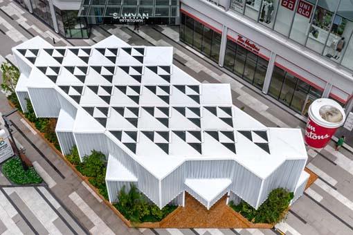 通過在場研究,讓新的城市居民能夠呈現和恢復到市井煙火氣的生活場景中。魔爾公寓項目不止于設計,編織生活哲學,編織魔爾和城市未來的故事。建筑主體結構是一座70年代廢棄多年的的紡織廠倉庫。用“編織與連接”的概念將老建筑喚醒新生命的設計主旨展開,老去的城市功能構筑物轉化為在創意文化區內的精品藝術家主題公寓酒店,空間將歷史與社區未來生活場景編制交錯,重溫場地記憶。原建筑平面布局為L形,由兩個廠房組成,總建筑高11.6m。改造過程中采用豎向構件將僅有三層的建筑形體在視覺上拉高比例,同時利用室外空調機位橫上布置將原建筑墻面無規律的造型變化進行遮擋;豎橫立面構件形成編織的立面圖案。